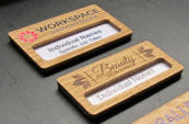 Quality ‘Bamboo’ faced badges available in different sizes with different window options giving you a sustainable option. Badge back made from recycled plastic.
